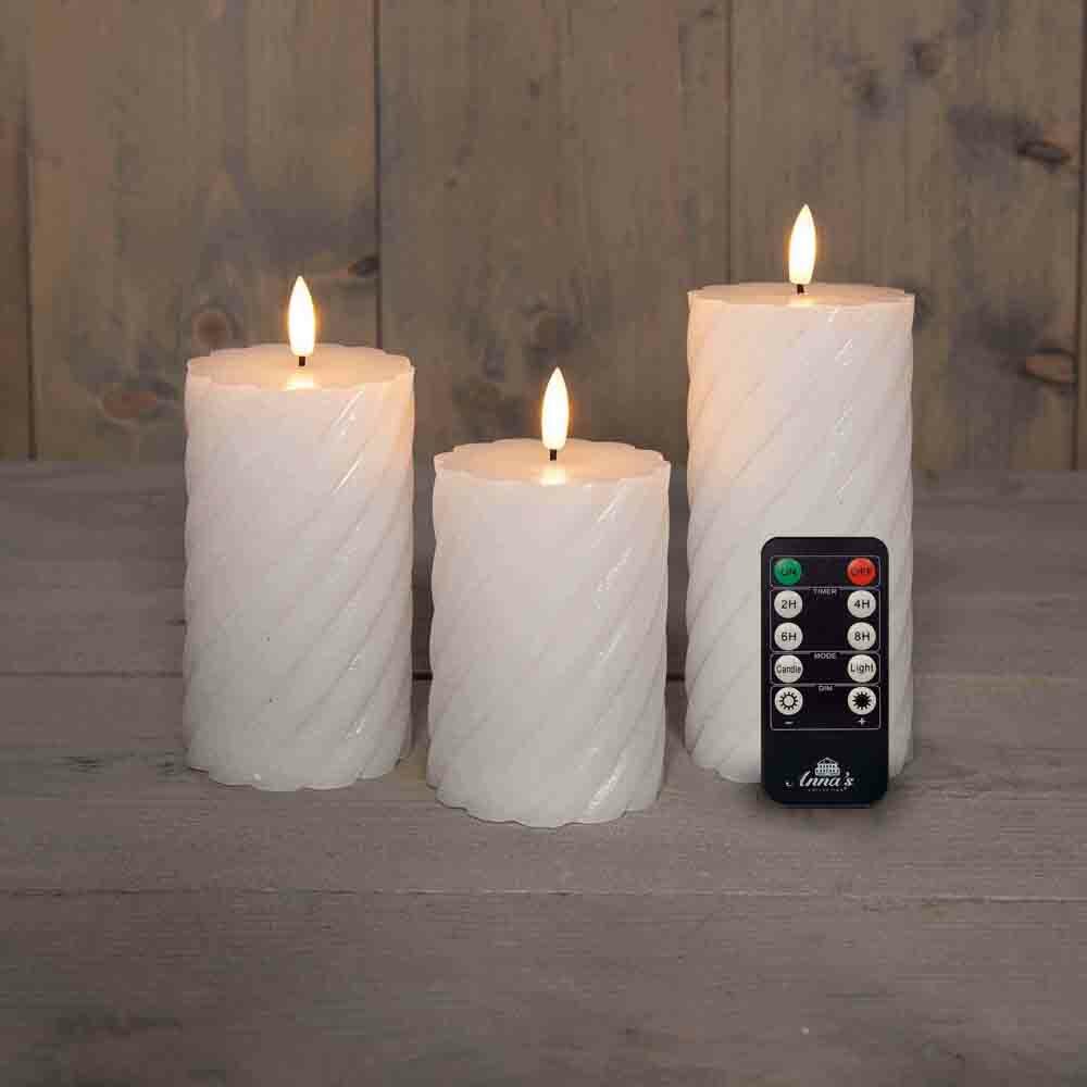 Wax swirl stompkaars met vlam 3D H10/12,5/15cm wit 3st LED
