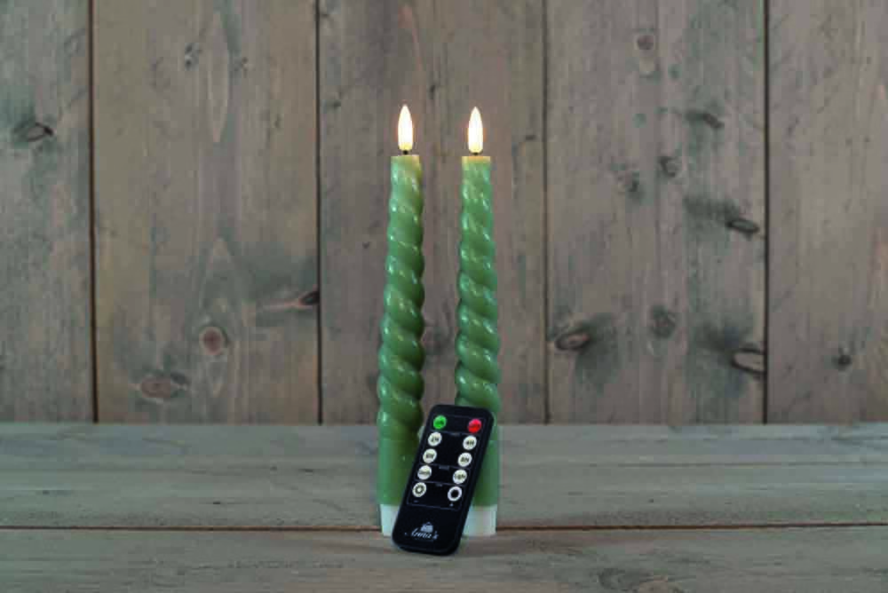 Wax swirl dinerkaars met vlam H23cm jade groen 2st LED