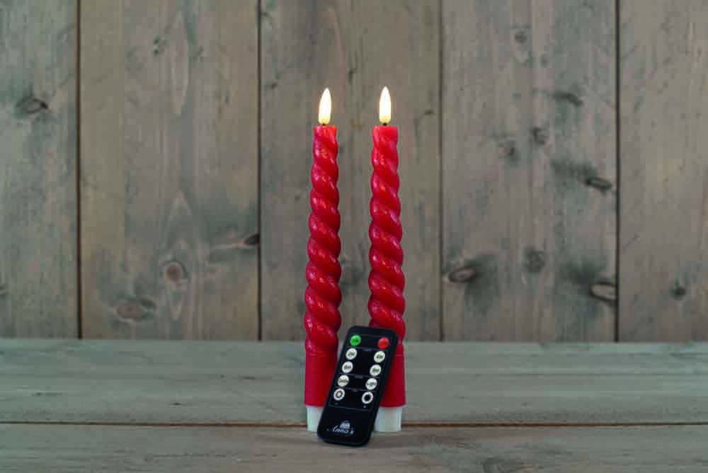 Wax swirl dinerkaars met vlam H23cm rood 2st LED