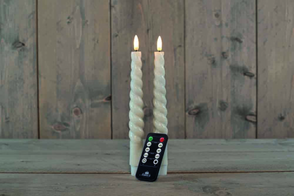 Wax swirl dinerkaars met vlam H23cm ivoor 2st LED