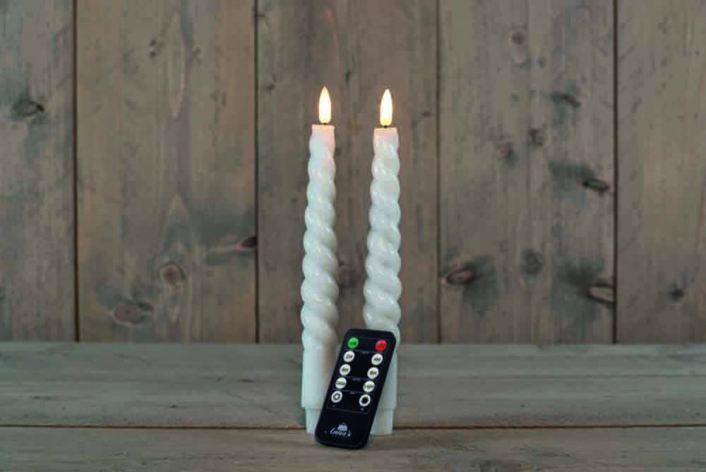 Wax swirl dinerkaars met vlam H23cm wit 2st LED