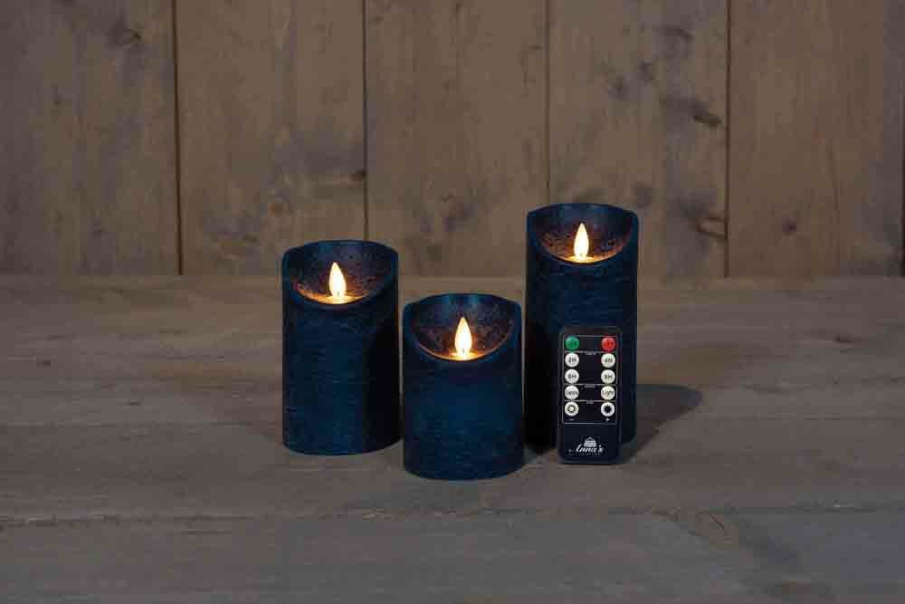 Wax stompkaarsen met bewegende vlam H10/12,5/15cm antiek blauw 3st LED