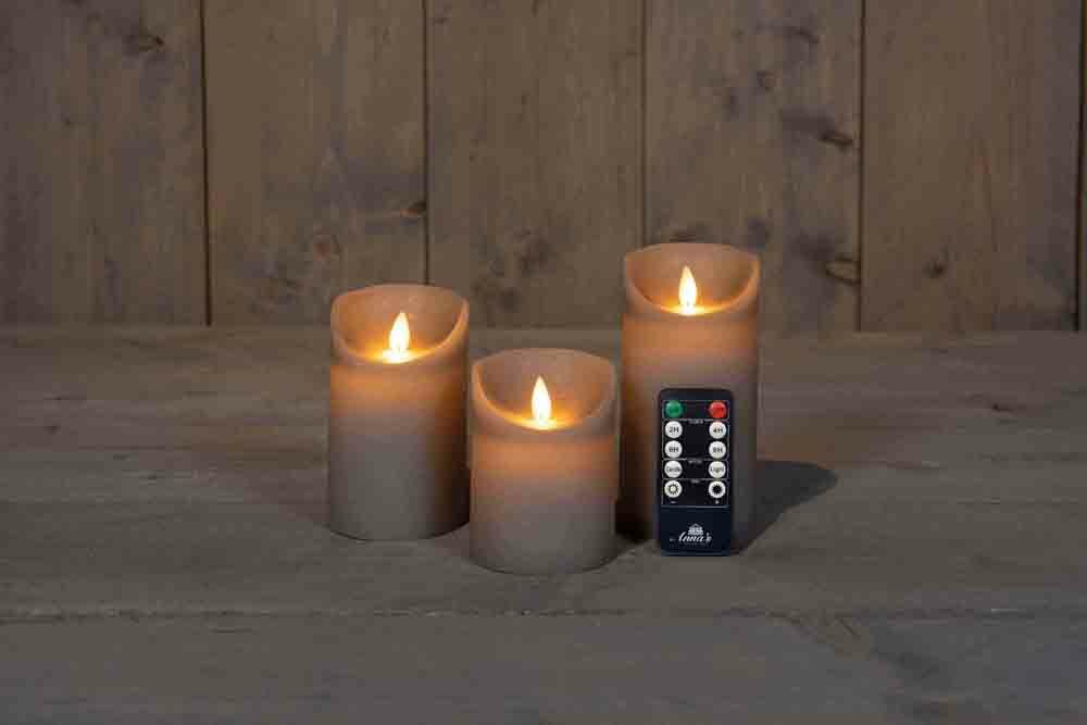 Wax stompkaarsen met bewegende vlam H10/12,5/15cm taupe 3st LED