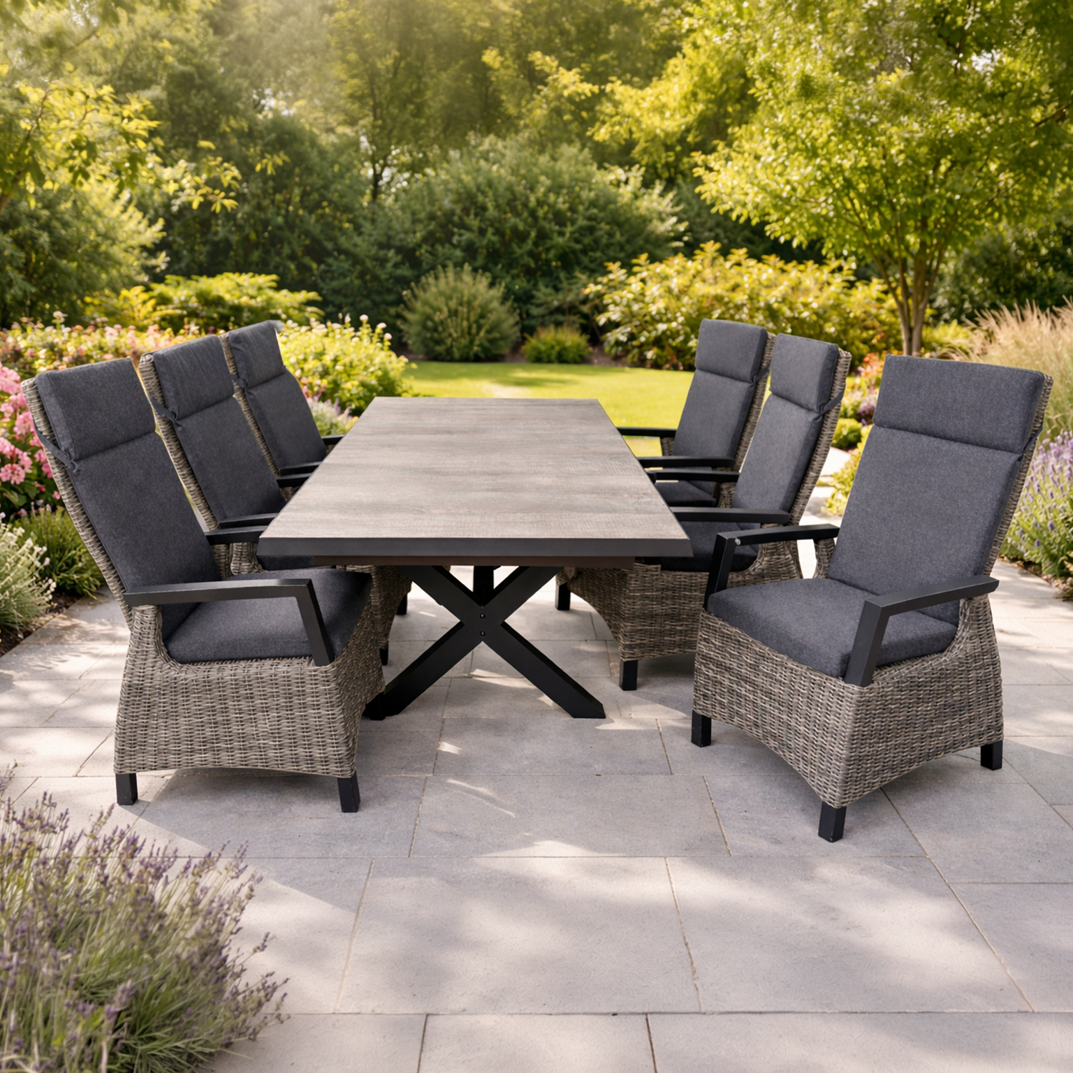 Deze zeer ruime Diningset heeft een uitschuifbare tafel welke met 60 cm is uit te schuiven. Ook heeft het een mooi keramisch blad. De stoelen zijn zeer luxe Dione stoelen, welke middels een knop verstelbaar zijn. De water- en vuilafstotende kussens zorgen ervoor dat deze diningset zeer lang mee gaat. Het aluminium frame dat wordt gebruikt kan niet roesten en gaat dus zeer lang mee.